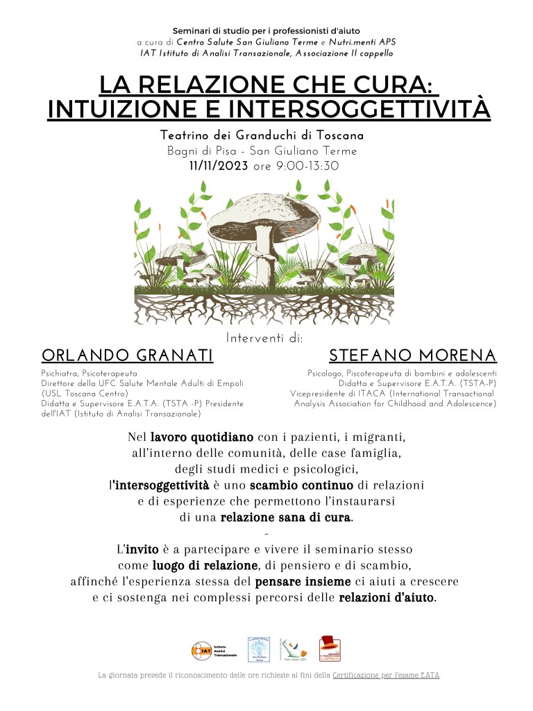 Si comincia così, con un desiderio di connessione e di condivisione, ed ecco che nasce un seminario di studi per i professionisti d’aiuto. Lo costruiamo e presentiamo come “Centro salute San Giuliano Terme” e “Nutri.menti APS”, realtà associative toscane che operano nell’area pisana e pistoiese, con iniziative dedicate alla diffusione della cultura psicologica, allo sviluppo della socialità e della partecipazione e alla cura dei bisogni di aggiornamento dei professionisti, in collaborazione con l’associazione “Il Cappello”, che si occupa di bambini e adolescenti in situazioni di disagio e con il patrocinio dell’istituto italiano di Analisi Transazionale IAT. Gli stimoli che ascolteremo nel seminario provengono dalle professionalità che abitano queste realtà associative.